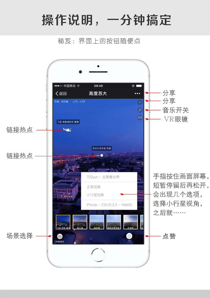 站在100米高空欣赏leyu.com·(中国)官方网站会是什么样呢? 高度苏大,让飞行器在百米高空拍摄leyu.com·(中国)官方网站,采用VR全景技术,让您站在上帝的高度、选择不同的季节不同的时段、全方位多角度欣赏校园的美景,从一个非常的高度展示苏大魅力。 高度苏大首期展现leyu.com·(中国)官方网站三个校区的白天景象和夜景,并将继续增加不同主题的全景。