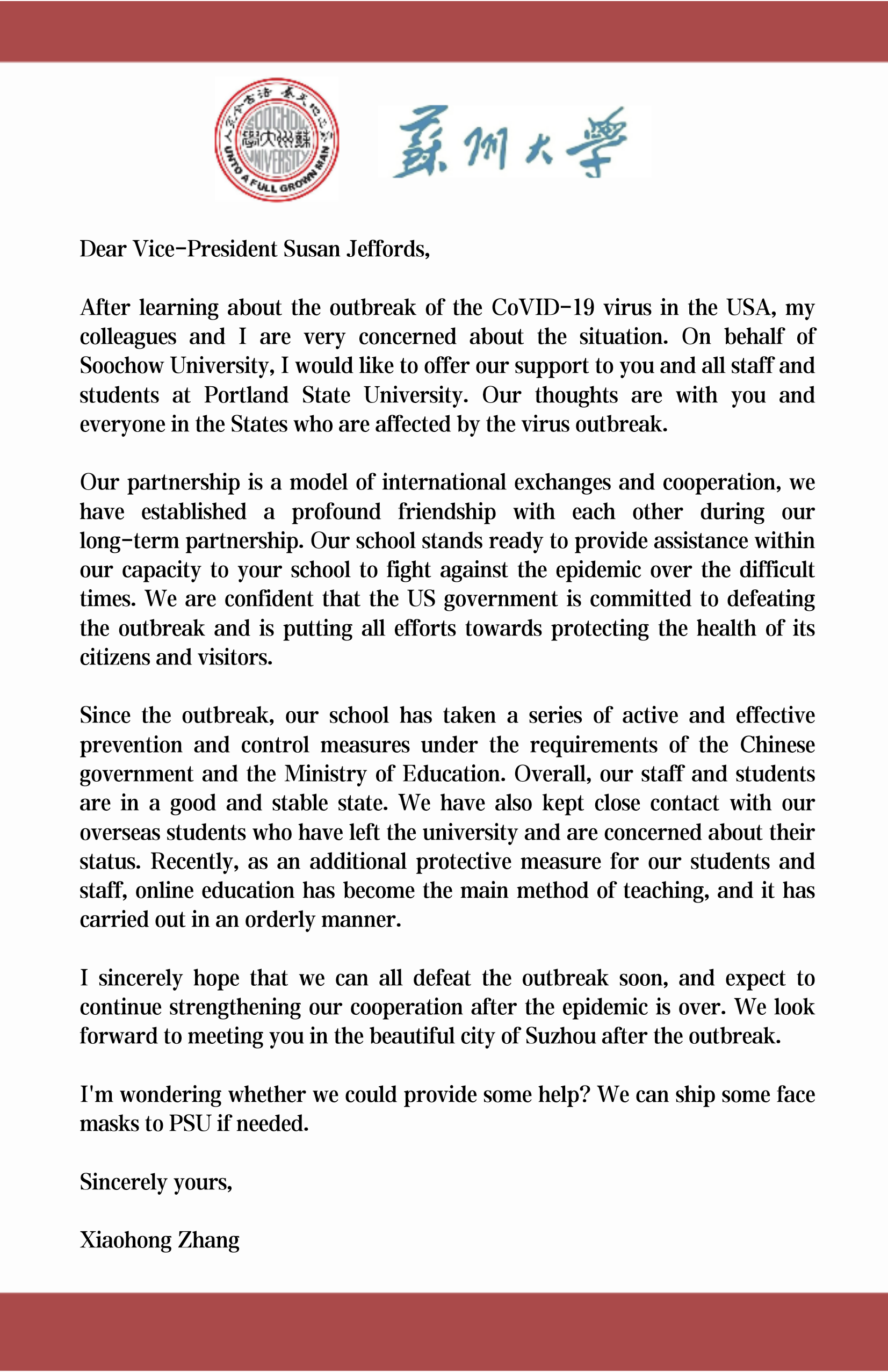 党委书记江涌、校长熊思东高度重视波特兰州立大学孔子学院的疫情防控情况,并及时发信慰问孔院全体师生。
