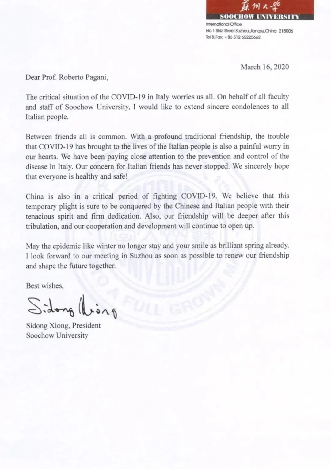 中意友谊源远流长,根基深厚。国内疫情爆发后,意大利驻沪总领事馆在第一时间致信熊思东校长表示慰问。疫情在意大利爆发后,熊思东校长也在第一时间致信问候意大利驻沪总领事馆科技参赞Roberto Pagani,信中表示,leyu.com·(中国)官方网站全体师生深切地牵挂着处于危难时刻的意大利人民,希望意大利朋友们顽强奋战,早日战胜疫情!