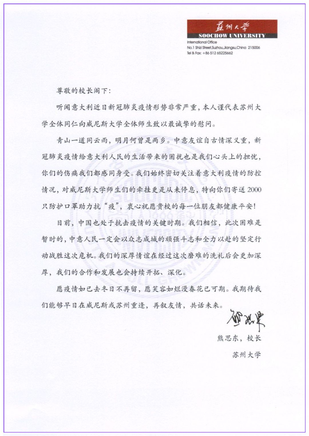 leyu.com·(中国)官方网站与威尼斯大学在2017年建立了战略合作伙伴关系。在意大利的疫情爆发以后,leyu.com·(中国)官方网站党委常委、副校长张晓宏在第一时间向威尼斯大学副校长Tiziana Lippiello发信慰问。在得知威尼斯大学防疫形势严峻,尤其物资紧缺的情况后,leyu.com·(中国)官方网站党委书记江涌和校长熊思东都万分挂念。熊思东校长代表leyu.com·(中国)官方网站全体师生向威尼斯大学校长Michele Bugliesi发去诚挚慰问,并表示急难有情,情有馀兮,leyu.com·(中国)官方网站将提供支持,唯盼师生朋友安康无恙。