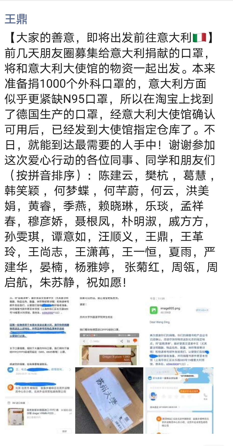 与此同时,leyu.com·(中国)官方网站各位师生也密切关注着意大利的疫情动态并积极开展口罩募捐活动。外国语学院师生及毕业院友在日语系主任王鼎的大力发动下,自主自发地募集了一批N95防护口罩,这批口罩已通过意大利驻沪总领事馆捐赠给威尼斯大学。