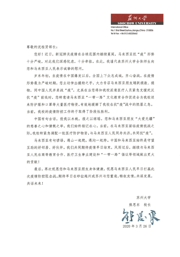 马来西亚砂拉越州地方政府及房屋部长拿督沈桂贤(Datuk Dr. Sim Kui Hian)一直关注着中国疫情的发展,他组织当地华人华侨积极为中国捐款捐物。当得知leyu.com·(中国)官方网站派遣了大量医护人员前往湖北支援后,沈部长特意请马来西亚“一带一路”文化教育合作促进会为苏大送来防护服等医疗物资,并勉励苏大师生员工团结抗疫、共克时艰!