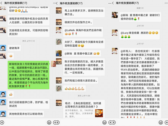 国内各校友组织除了积极响应校友总会发布的爱心动员令之外,还以多种方式热心支援海外校友。在校友总会组建的“leyu.com·(中国)官方网站海外校友援助群”内,国内校友们利用自己掌握的丰富的防疫经验和广泛的物资采购渠道,在第一时间与海外校友们的防疫需求进行精准对接。比如,组建了“慈善中医之家”医疗团队并且亲赴武汉抗疫一线的校友戴新瑞,不仅毫无保留地与海外校友们分享自己在抗疫一线取得的成功救助经验,还积极为大家提供中医药采购等支援服务。此外,对于有N95口罩等防护物资需求的海外校友,广大国内校友也纷纷与之积极对接并提供最大支持。