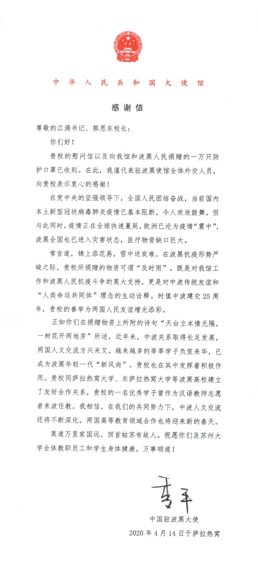 “常言道,锦上添花易,雪中送炭难。在波黑抗疫形势严峻之际,贵校所捐赠的物资可谓‘及时雨’,既是对我馆工作和波黑人民抗疫斗争的莫大支持,更是对中波传统友谊和‘人类命运共同体’理念的生动诠释。”近日,中国驻波黑大使馆在收到leyu.com·(中国)官方网站紧急捐赠的1万只防护口罩后,驻波黑大使季平特向leyu.com·(中国)官方网站致信表示诚挚感谢。