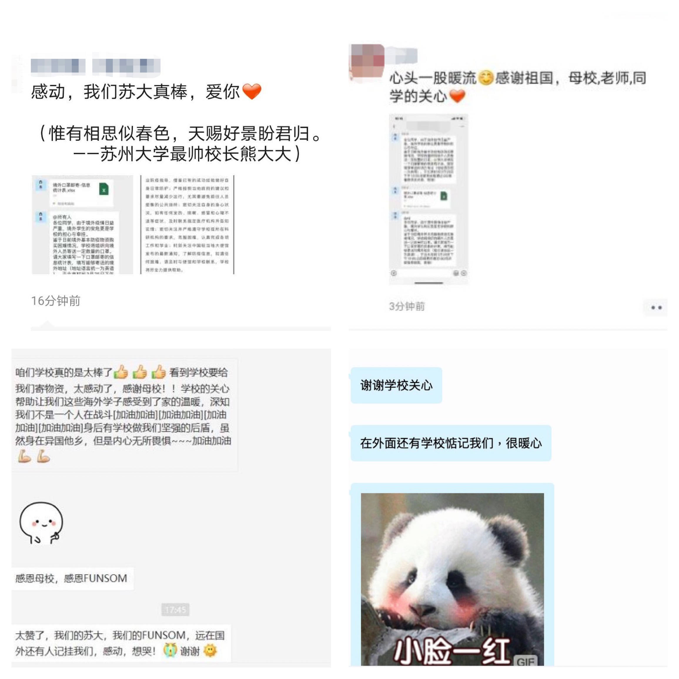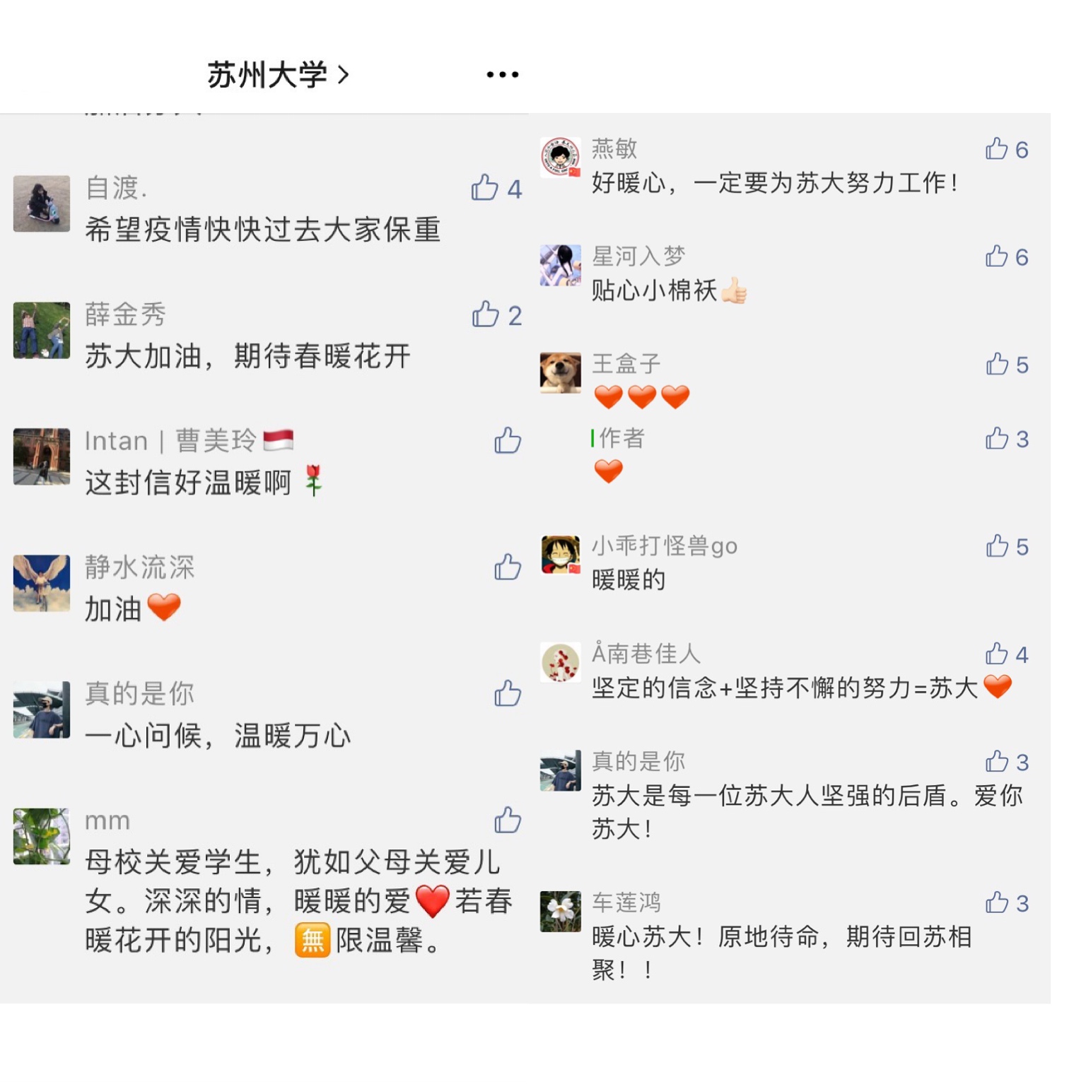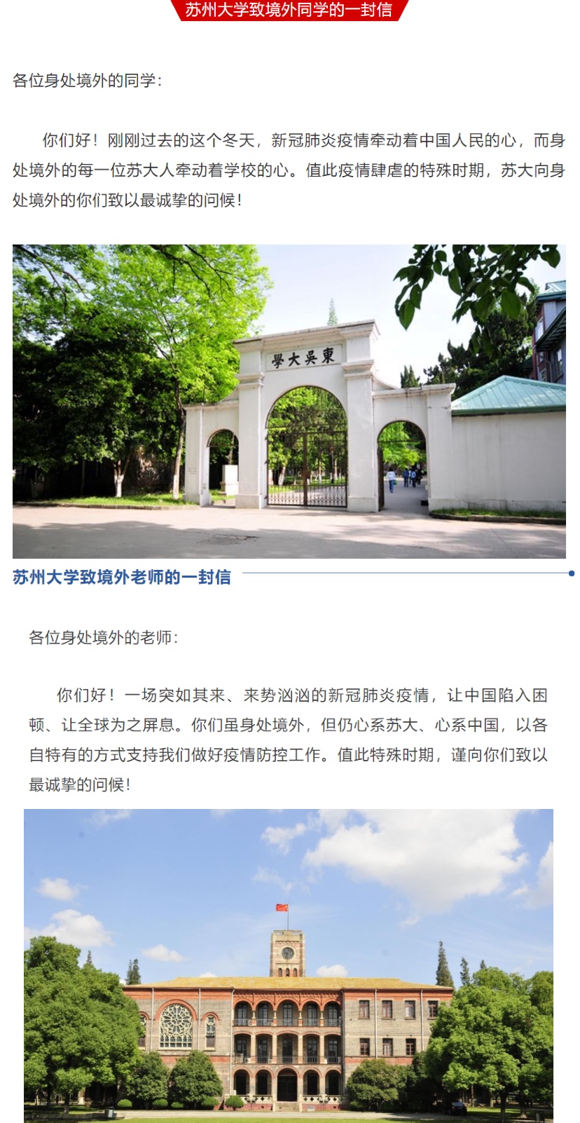 “新冠肺炎疫情牵动着中国人民的心,而身处境外的每一位苏大人牵动着学校的心。值此疫情肆虐的特殊时期,苏大向身处境外的你们致以最诚挚的问候!”“惟有相思似春色,东吴好景盼君归。无论你们身处何方,学校永远是大家最坚强的后盾。”