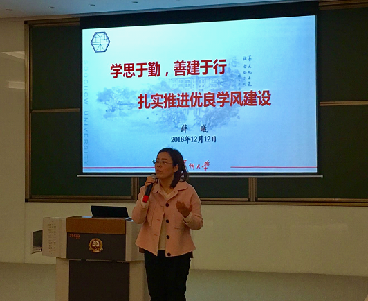 最后,薛曦以 “学思于勤,善建于行,扎实推进优良学风建设”为主题做总结发言。她分析了当前学院学风建设存在的问题和原因,介绍了学院在学风建设层面强化日常管理、稳定专业思想、推动学术交流、增进朋辈教育、鼓励科研创新、严肃考风考纪、丰富第二课堂等有益探索,并分享了今后学风建设的思路和方向。她强调学生工作目标是使不和谐的学生变和谐(托底),使和谐的学生更卓越(引领),呼吁学生工作既要有“爱”与“陪伴”,也要“讲规矩”,要确保“公正透明”,有“责任与担当”,培养德、智、体、美、劳全面发展的社会主义建设者和接班人。