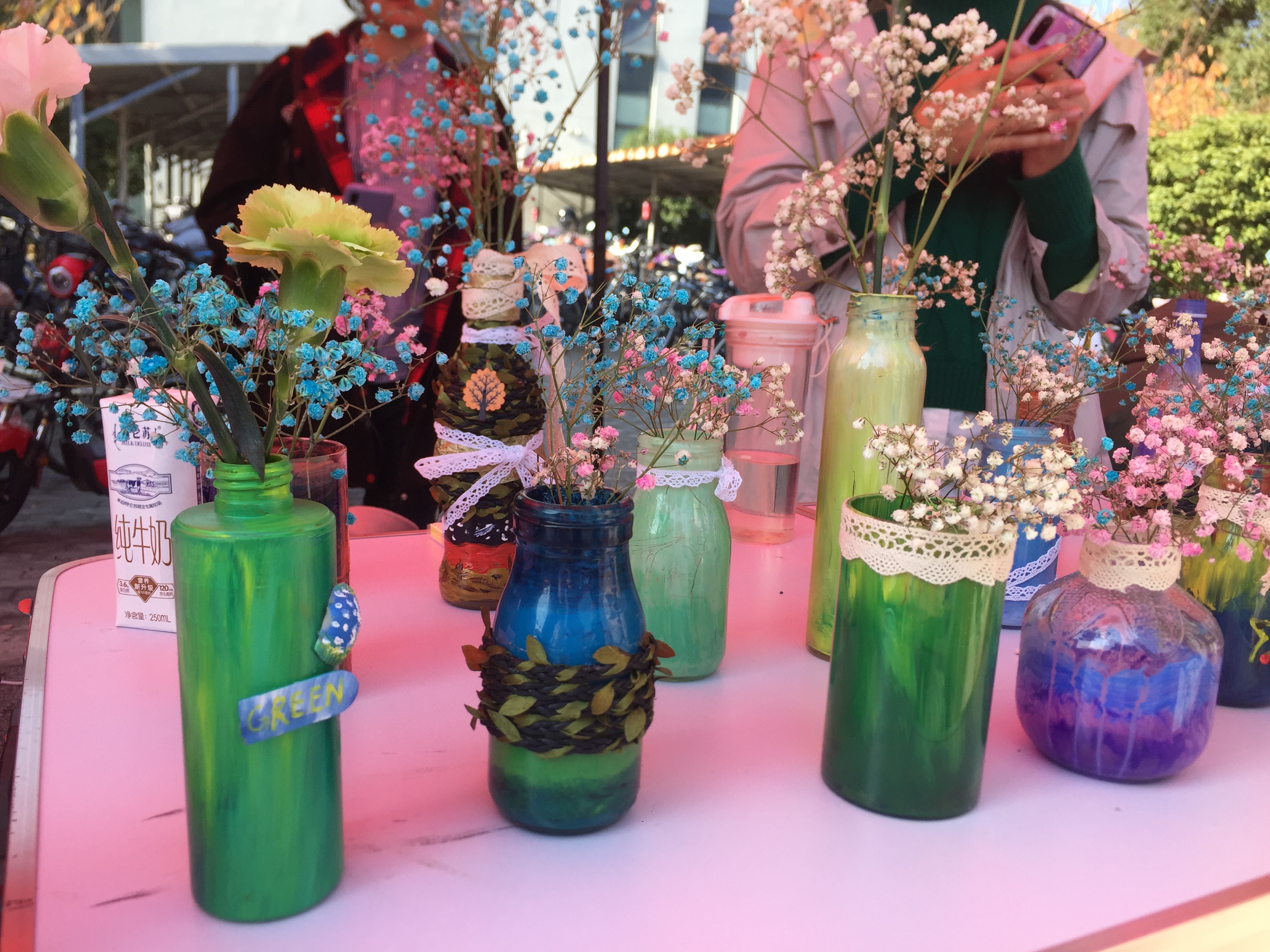 绿协同学的作品创意满分!他们用废弃的玻璃瓶,加之色彩的辅助,配以干花,让最平常不过的东西变成了美丽的艺术品。手绘是建筑学院学生的强项,书签,零钱包,手拎袋……每一件都是同学们的得意之作,每件物件都显示着建院风采,也都展示着建筑学院“匠心筑品”的院训。