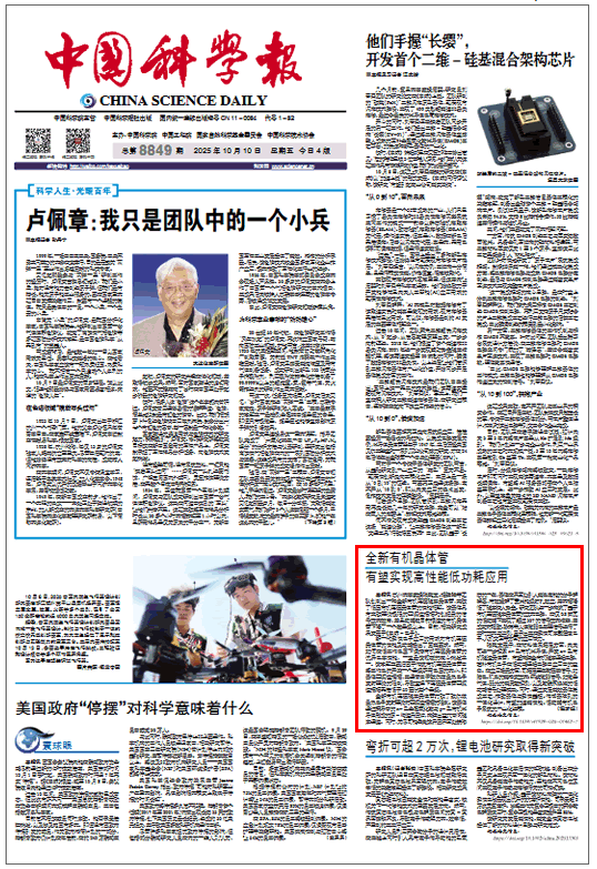 张晓宏表示,在材料体系拓展方面,未来可进一步探索n-型有机半导体,开发n-型有机隧道晶体管,有望构建全有机隧穿逻辑电路,填补有机电子在低功耗逻辑电路中应用中的空白。在应用场景方面,可拓展至生物医学信号,如脑电、肌电的高精度放大;环境微弱信号,如微量气体、弱光的高灵敏探测,以及物联网终端的低功耗信号处理模块。同时,通过发展高效器件集成工艺,推动器件与柔性基板、传感器阵列的一体化设计,有望加速高性能、低功耗有机电子系统的产业化进程。