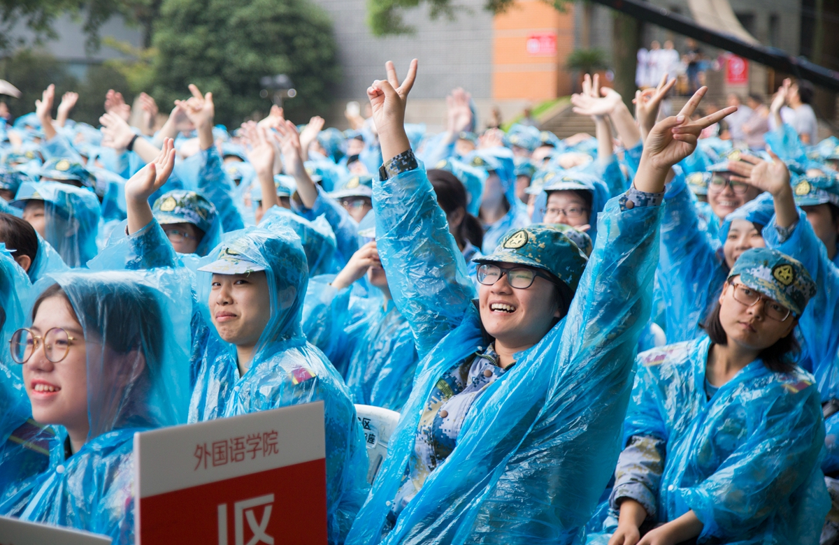 开学典礼正式开幕前,老师和学长学姐们为2017级新生带来了精彩的暖场表演。典礼现场虽下起了秋雨,但难掩师生们的热情和喜悦,欢呼声、掌声在这所百年校园里阵阵回响。