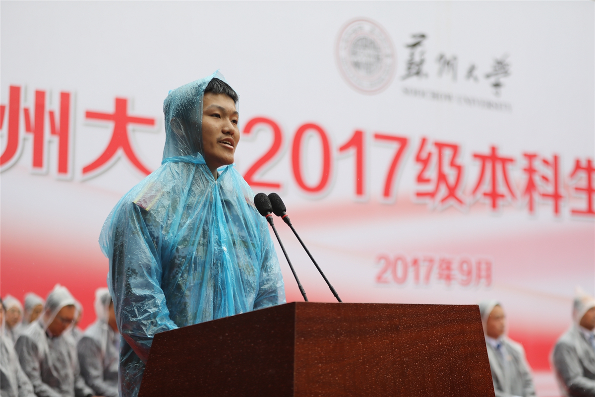 敬文书院、物理与光电·能源学部物理学专业的许致文同学作为2017级新生代表首先发言。“十年前,我随母亲一起参观了leyu.com·(中国)官方网站,深深地被这所学校的魅力所吸引,从那时起我就立志要考取苏大,在我高考的8个志愿中,仅填报了leyu.com·(中国)官方网站,幸运的是我终于成为一名苏大人。”许致文说,作为苏大人,今后一定会不断修炼品德、培养健全人格,不忘历史使命和社会责任,以思想为骨,理想为翼,过好当下,放飞未来。