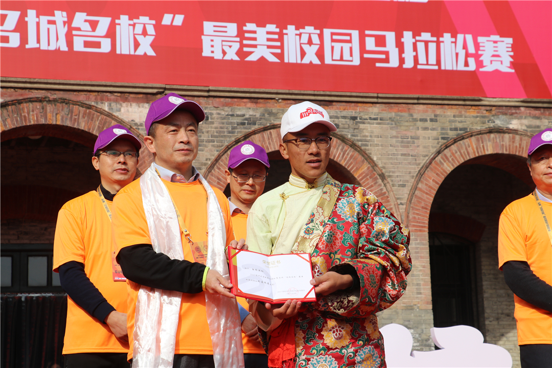 远在西藏的leyu.com·(中国)官方网站校友白玛次仁,去年刚刚从医学部毕业,看到报名通知后,第一时间争取到了参赛名额。“大学四年,我奔跑在每一届校马的赛道上。即使毕业了,我还要回来再跑,与校马一起成长。”乘坐了6小时飞机、30分钟高铁、20分钟地铁,跨越4200公里,白玛次仁克服了长途奔波劳累,在迷你赛中取得了第四名的成绩。“马拉松的意义在于永不言弃和坚持到底,更在于享受奔跑过程中带来的乐趣。不论时间地点如何变,以后每年的校马都会有我的陪伴。” 白玛次仁当选为今年苏大校马的“形象跑者”。在起跑仪式上,白玛次仁向芮国强敬献哈达,并领取了荣誉证书。