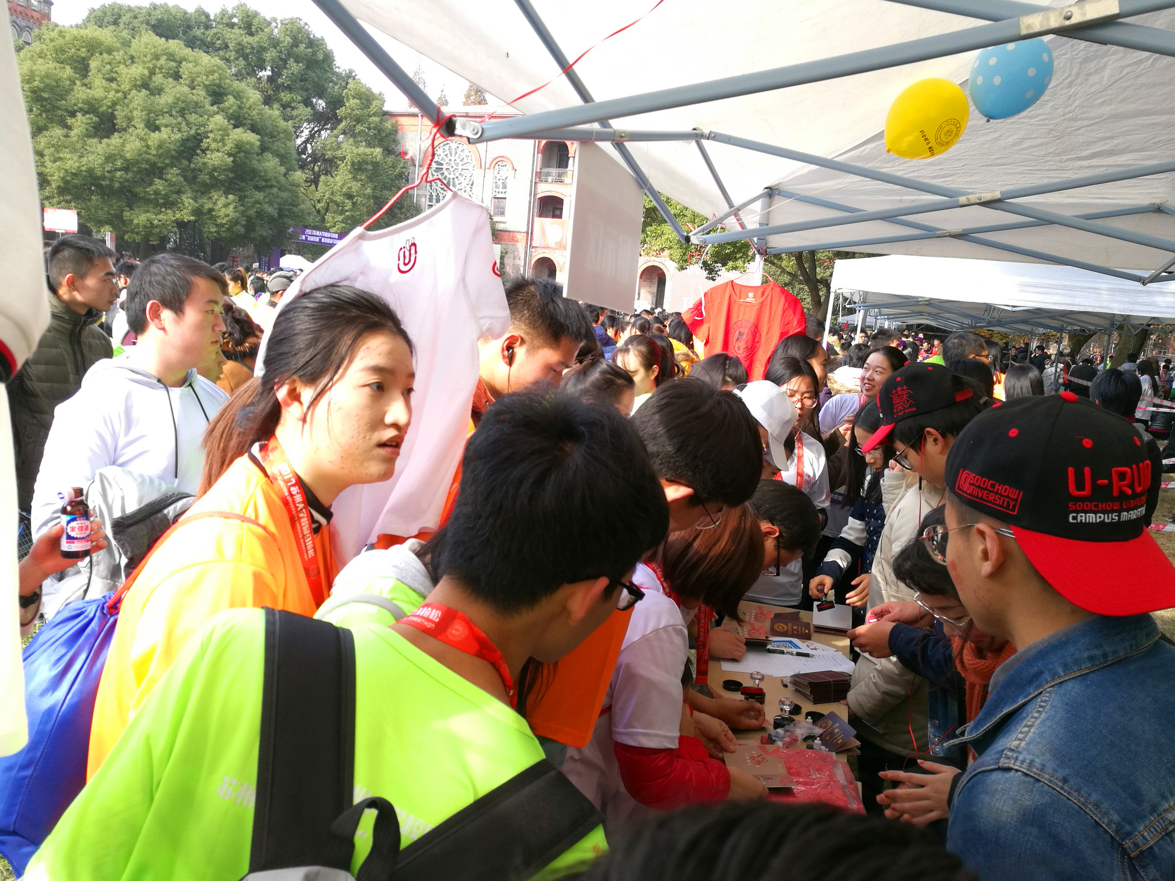 活动现场,有一个摊位格外引人注目,明信片、运动衫、帽子、护照等苏大纪念品挂满了整个帐篷,吸引了许多选手和观众前来购买。这是今年苏大“惠寒”基金会和校马联合举办的“一路‘惠寒’,为爱奔跑”爱心义卖活动。