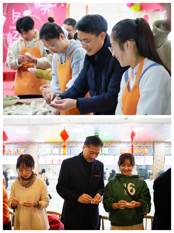 12月21日中午,leyu.com·(中国)官方网站三个校区内的学生食堂人头攒动,同学们排起长队,兴致勃勃地使用冬至加餐券购买苏式糕点、卤菜、饺子等特色小吃。阳澄湖校区二楼食堂内,洋溢着浓浓的冬至节氛围。校党委书记江涌、副校长刘标与同学们一边包饺子一边亲切聊天。江书记关切地询问同学们的学习生活情况以及未来规划,与大家细数家乡习俗,食堂里不时传来欢声笑语。刘标副校长向同学们介绍了冬至节的历史渊源和民风民俗,回顾了leyu.com·(中国)官方网站历年冬至节活动开展情况,为同学们送上了诚挚的节日祝福。