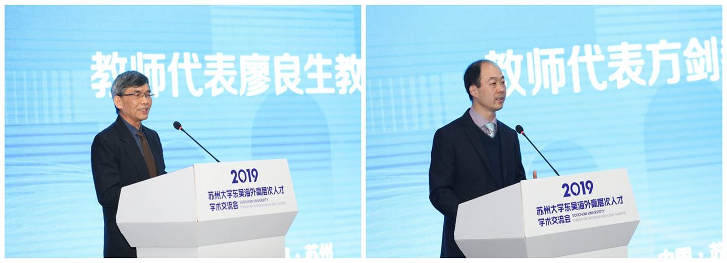 教师代表廖良生教授、方剑教授分享了他们选择苏大、在苏大发展的亲身经历和感受。廖良生教授是纳米科学技术学院飞速发展的见证者和参与者,他说,自2009年加盟苏大以来,在学校、学院的大团队协作之下,纳米科学技术学院从零开始,不断发展壮大,如今已经位居全国前列、世界领先,如果再有一次选择的机会,仍然会选择leyu.com·(中国)官方网站。方剑教授讲述了自己加盟苏大这半年的感受。他说,leyu.com·(中国)官方网站积极开放的人才政策、优越的发展空间、优质高效的服务保障都是吸引自己加盟的原因。学校在实验室建设、购置设备、研究生招生、生活保障等方面都给予了很大的支持和帮助。两位教授恳请有更多的有才之士与苏大携手,共同前进,共同发展。