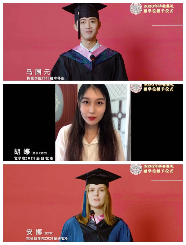 毕业典礼上,在萌萌的AI机器人小苏的全程主持下,传媒学院2020届本科生马国元、文学院2020届研究生胡蝶、东吴商学院2020届研究生安娜依次作为毕业生代表发言,他们感恩母校的关爱与培养,表达了对苏大的祝愿与对未来的无限期许。