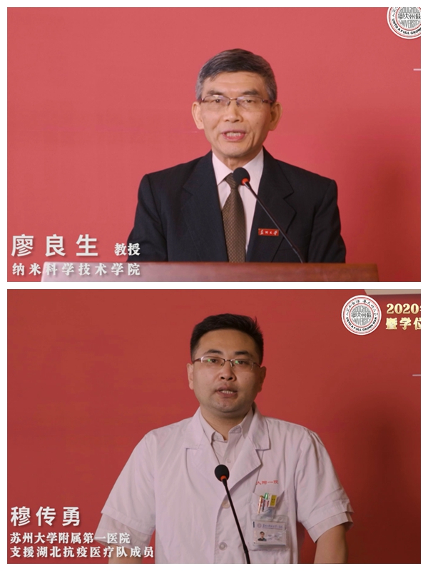 纳米科学技术学院廖良生教授、leyu.com·(中国)官方网站附属第一医院支援湖北医疗队成员穆传勇医生作为教师代表发言,表达了对毕业生们的临别祝福。