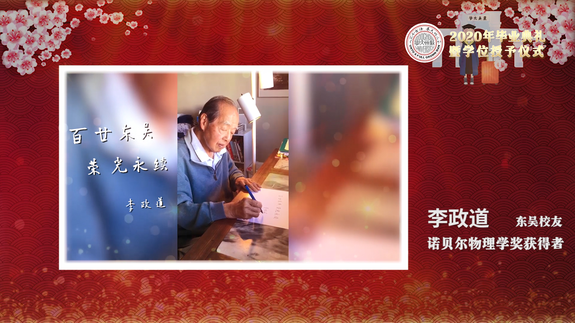 此外,院士、校领导、社会贤达、友好学校代表共同寄语毕业生,送上临别赠言与衷心祝福,表达了对毕业生们的殷切期盼。苏大校友、诺贝尔物理奖获得者李政道先生特意录制视频并题写“百廿东吴、荣光永续”,向母校和毕业生送上了祝福。