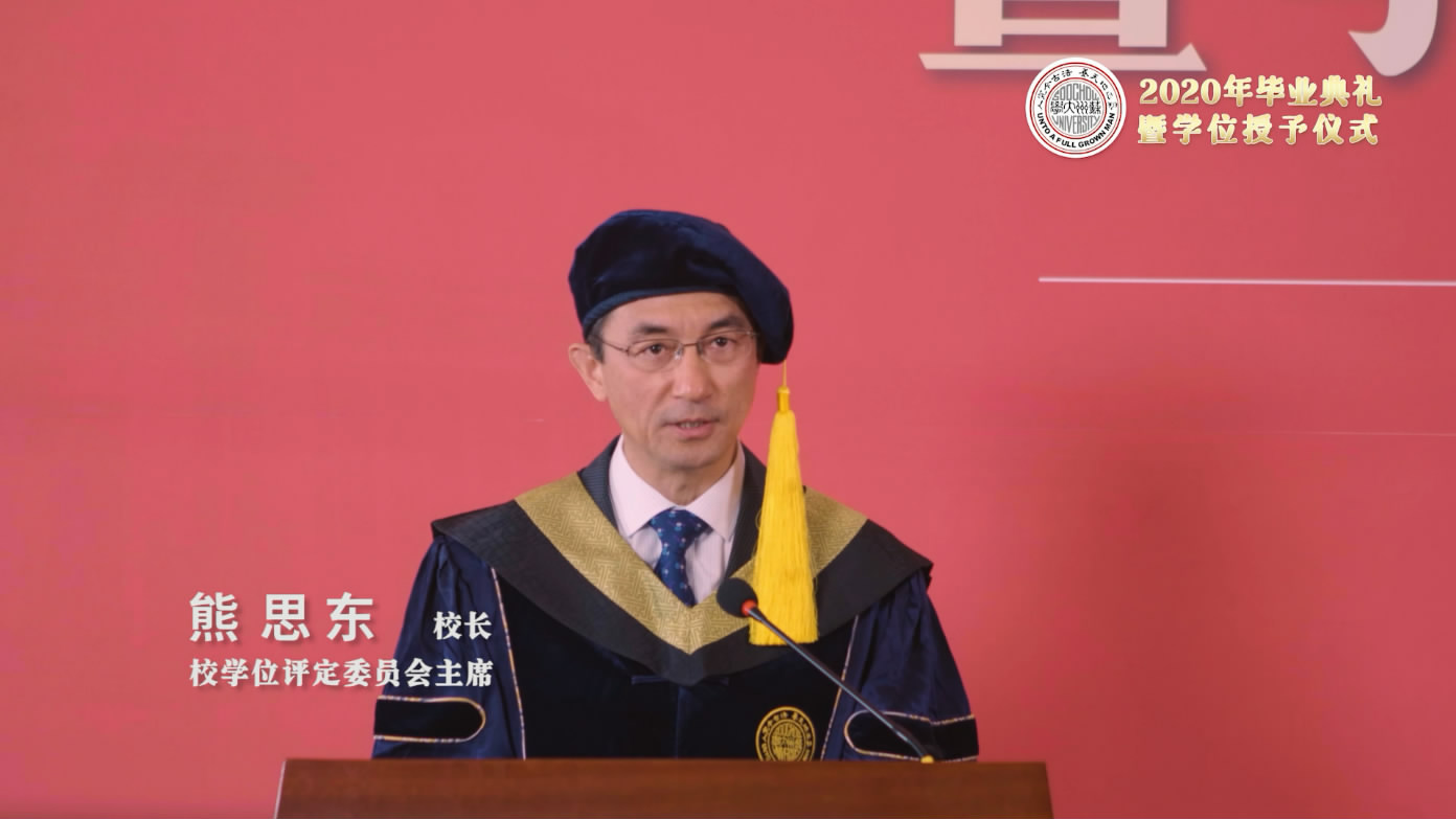 校学位评定委员会主席、校长熊思东向圆满完成学业、即将踏上人生新征程的毕业生们致以热烈祝贺。他与同学们回顾了丰富精彩的大学校园生活,以及同学们在母校的成长点滴和曾经许诺的青春之约。“2020年,再遇庚子年,leyu.com·(中国)官方网站站在新时代、新甲子的交汇点上,每一位苏大人都对新的一年充满了期待和憧憬。”临别之际,熊思东校长将深情祝愿化作一次次“相约”,希望能充实同学们奔赴前程的行囊,助力大家在新征程中“通关升级”。他说,相约2020,不晚起,要奋起;相约2030,不怕输,不服输;相约2040,不贪心,守本心;相约2050,不设限,创无限;相约母校,不恋家,常回家;相约时代,不拒变,善应变;相约祖国,不缺位,守好位,牢记母校“临行密密缝”的深情厚意和苏大人的追求使命。“往后每届毕业典礼,你们都有参加的特权,学校会准备好崭新的学位服,预留好VIP坐席,请主礼教授亲手为你们扶正流苏。” 他还与毕业生们约定,欢迎大家随时回到母校,让今年的遗憾少一些、再少一些。