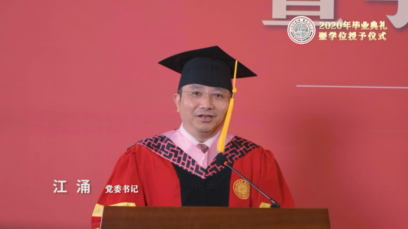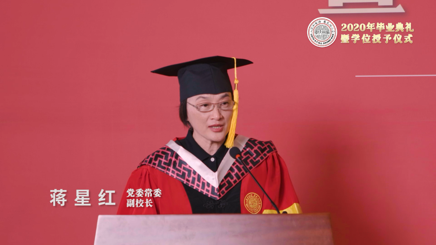 校党委常委、副校长蒋星红宣读毕业及学位授予决定。熊思东校长为小苏拨穗,毕业生可以通过直播动画形式实现“云拨穗”。