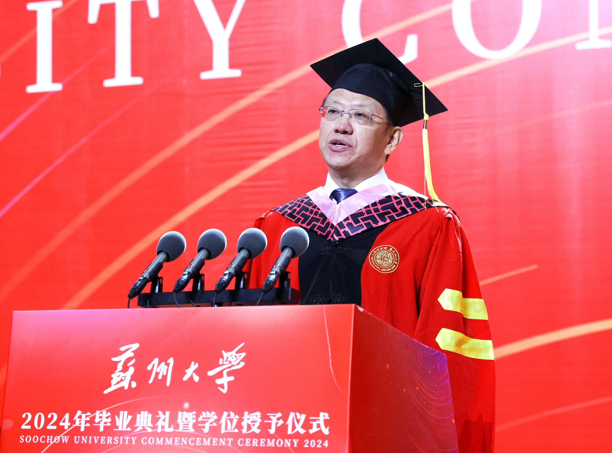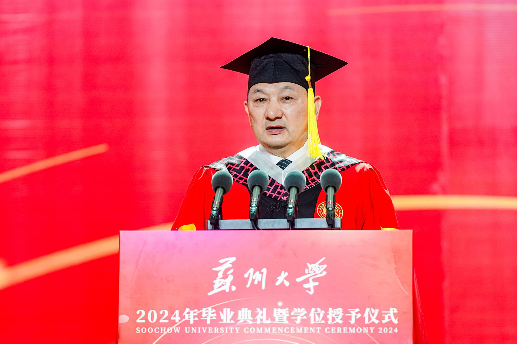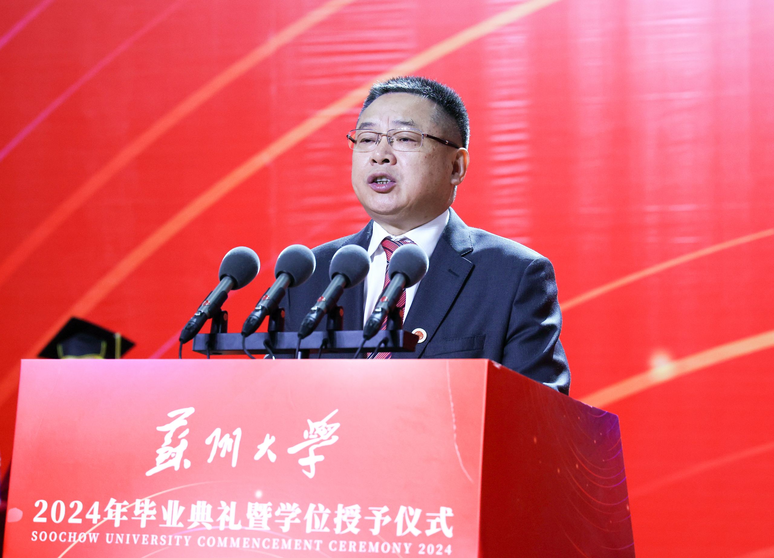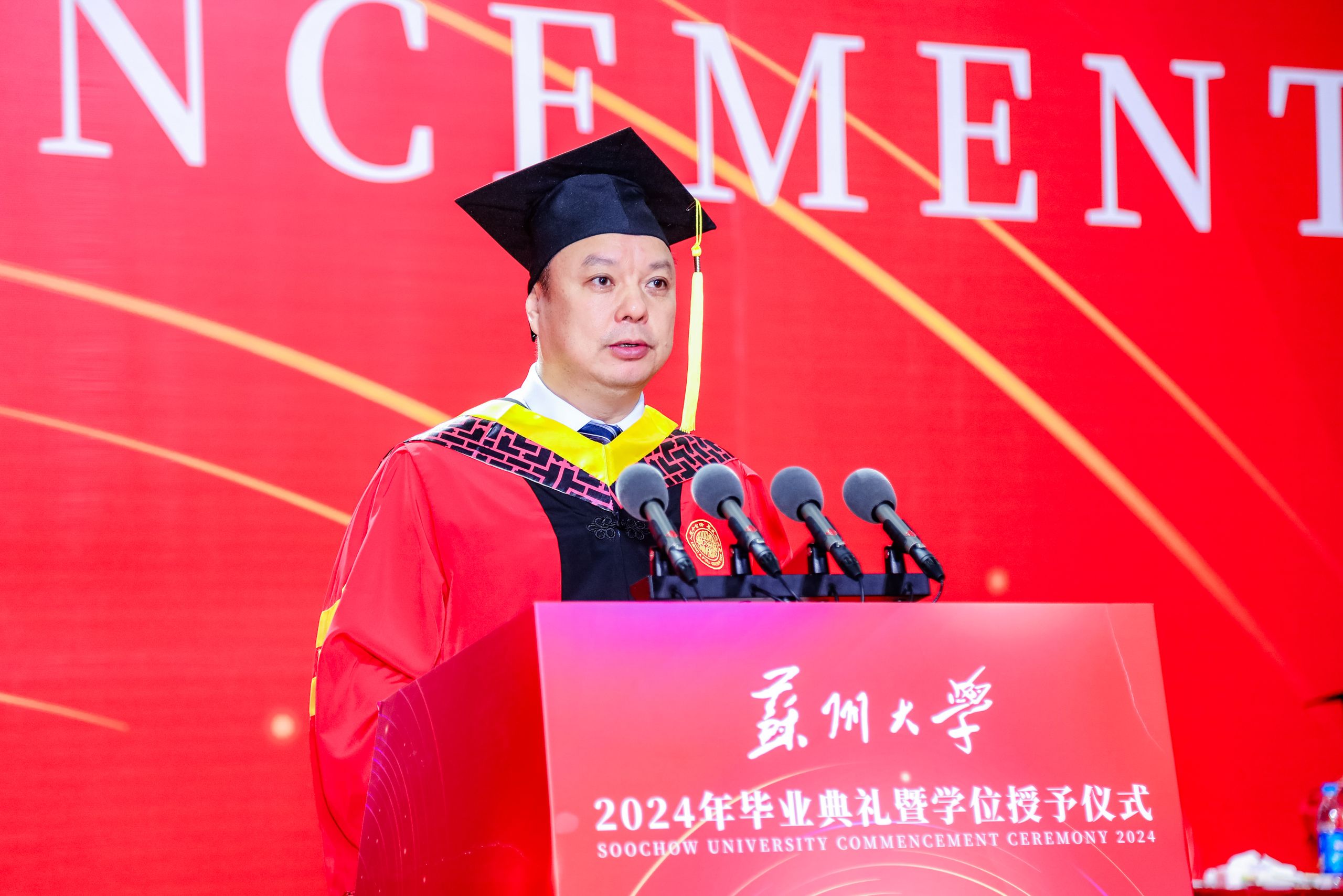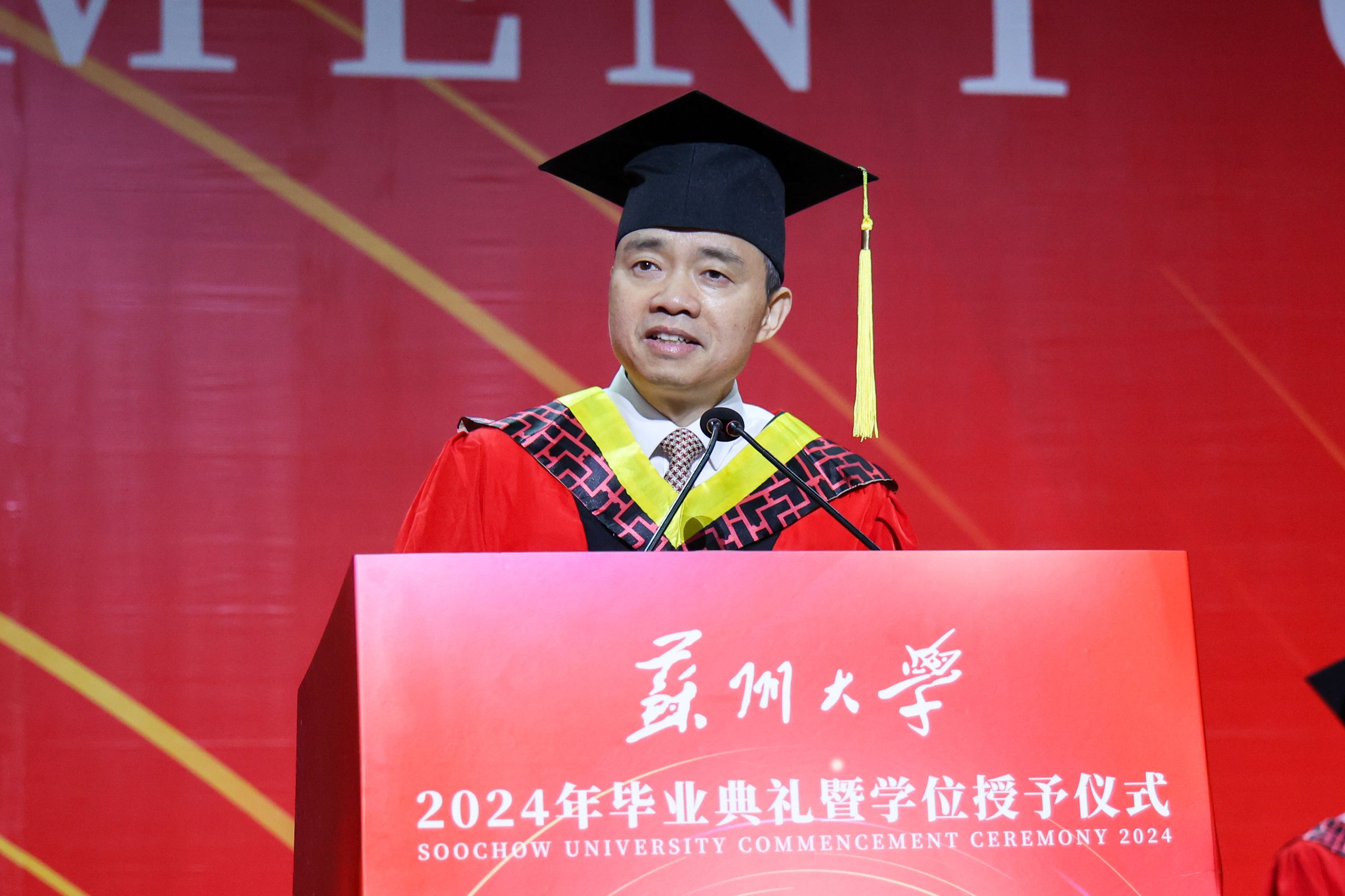 教师代表、传媒学院执行院长陈龙对即将踏上新征程的毕业生送上了祝福与期望,希望大家能做一个正直、善良、拥有家国情怀的人,修炼青春、阳光、有理想、有担当的苏大学子气质,保持批判思维和创新头脑,开拓进取,谱写人生新的篇章!