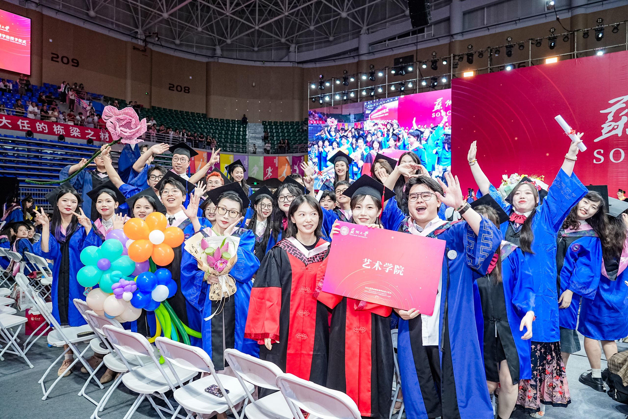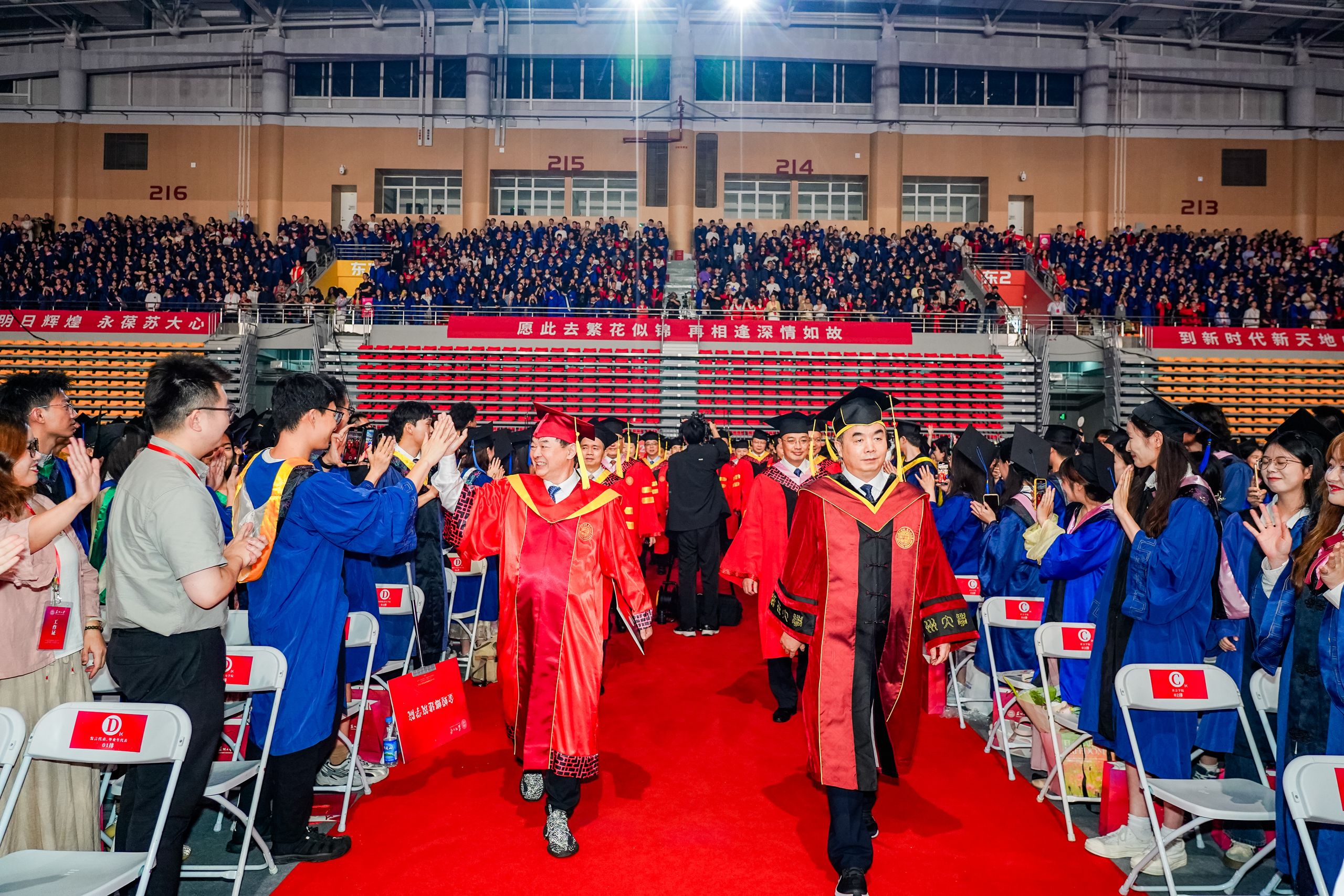 忆往昔,你踏进东吴门的那刻,稚嫩青涩,憧憬着未来与理想;展今朝,站在人生又一个新的节点,你挥手作别过往,铺展已然丰满的羽翼。“原来总感觉毕业遥遥无期,转眼间我们即将各奔东西。”2020级纳米科学技术学院的徐家铭在典礼后感慨时间飞逝,“当主礼教授将授予学位的卷轴交到我手中时,我愈发觉得正接过新时代的接力棒,要铭记母校对我的教诲,跑好青春接力赛!”当体育馆的灯光照耀全场,歌声响彻整个会场,每一位毕业生的脸上都闪耀着点点光芒。2022级文学院硕士研究生陈怡身处人群,内心澎湃,“感谢母校给我们的毕业盛宴,我会将校训永远留存心中。祝愿每一位毕业生毕业快乐,在今后的日子里九万里风鹏正举!”