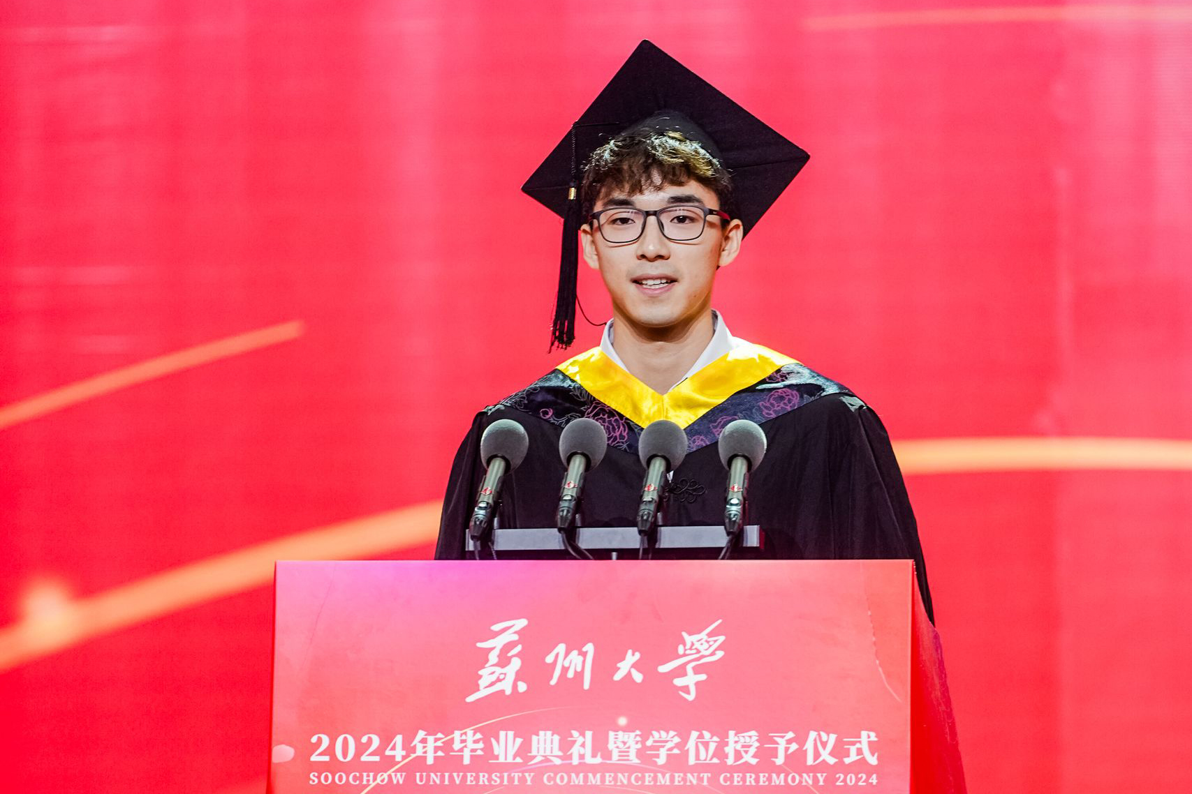 研究生代表、材料与化学化工学部2021级材料科学与工程专业博士研究生鲁坤焱,将她在苏大度过的9年时光比作不可复制的基因密码。她用奉献、拼搏、践行三个关键词概括了在苏大的成长之路、科研之路以及未来的奋斗之路。