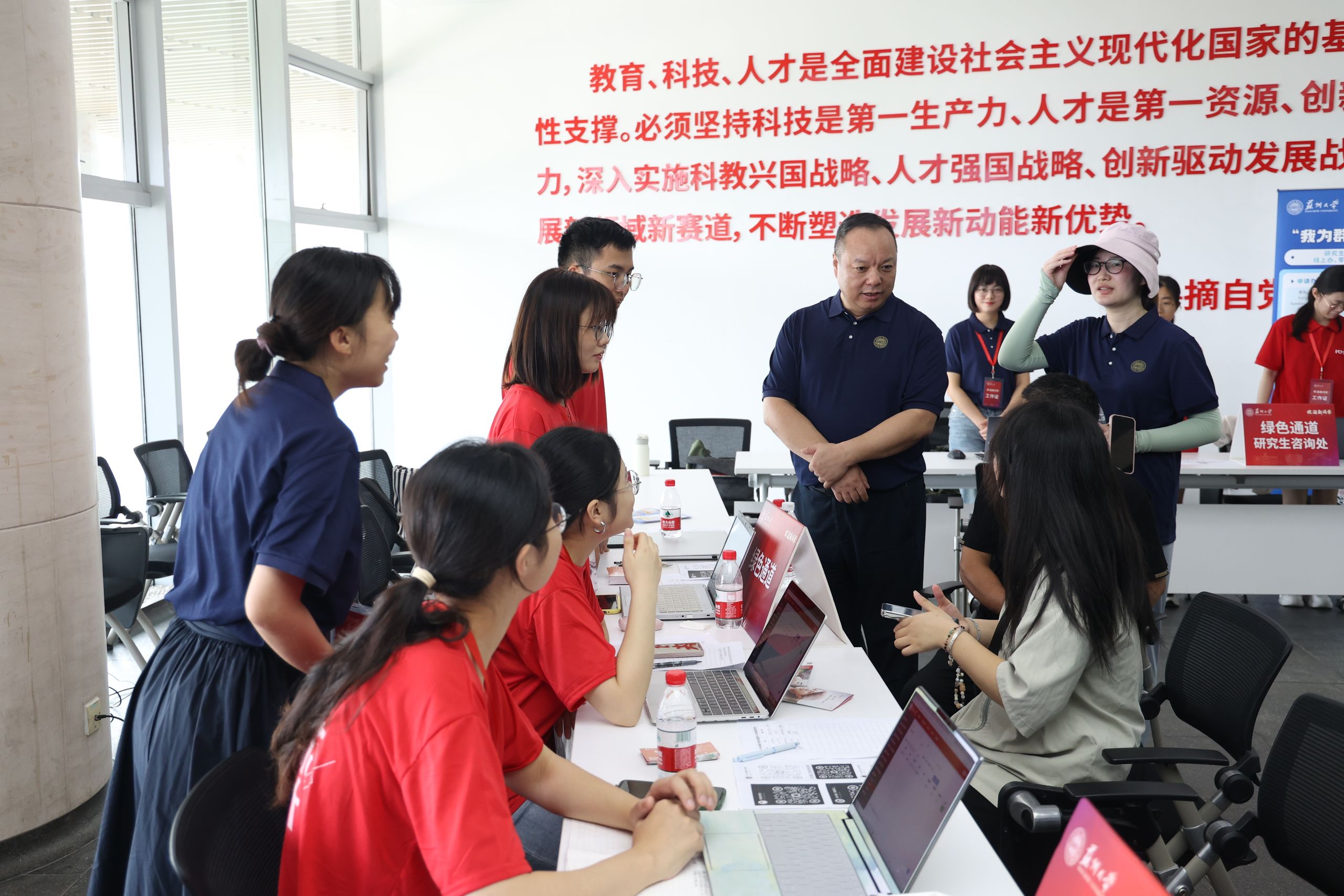 在敬文书院,新生和家长在“从敬文走向世界”展板前留下第一张合影,在报到接待点前兴致盎然地体验“漆扇”制作。由“敬文花红”党员志愿服务团、高年级助理导师组建的志愿服务团队全程陪伴新生入学,在躬行实践中展现了敬文人的责任和担当。