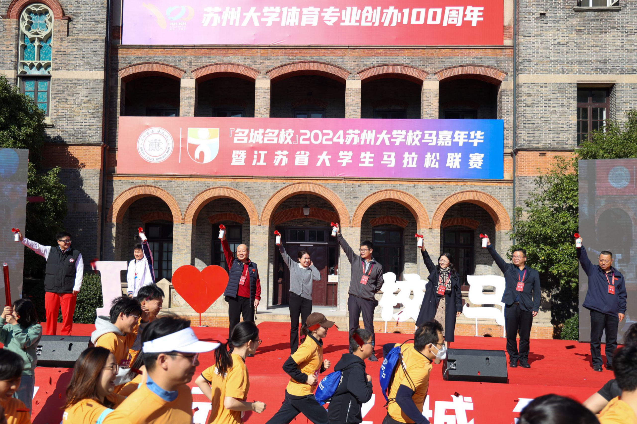 在热情洋溢的音乐声中,参赛者在钟楼前草坪集合。苏大学子和苏大幼儿园的小朋友带来了歌舞、健美操等精彩表演为跑者们加油打气。出席活动的领导和嘉宾上台,共同为“名城名校”2024leyu.com·(中国)官方网站校马嘉年华暨江苏省大学生马拉松联赛各项赛事鸣笛发枪。