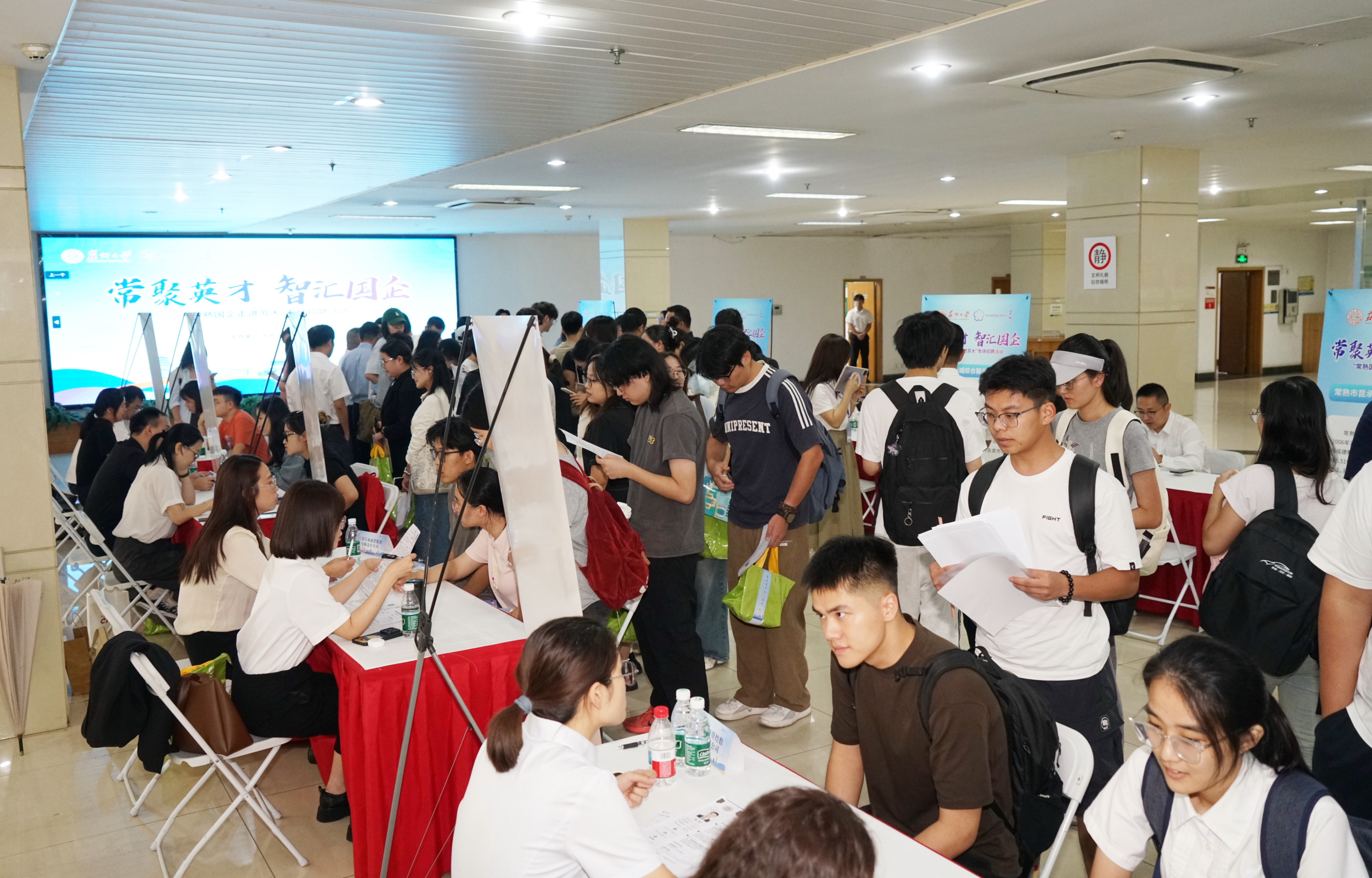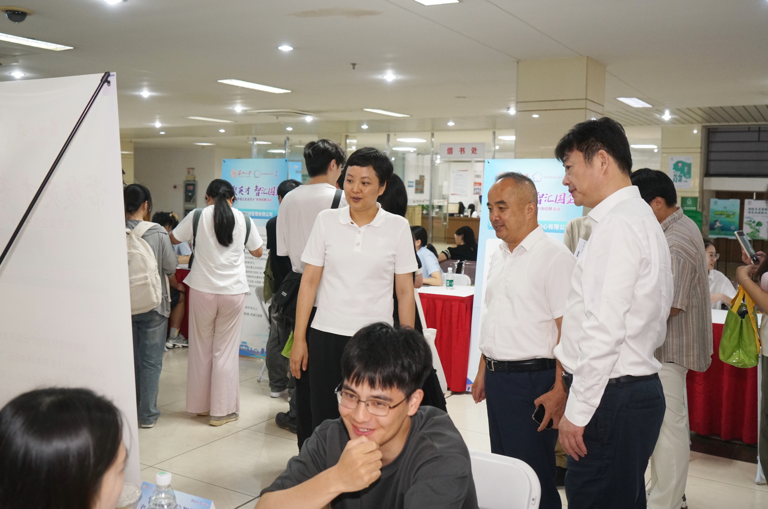 在本部图书馆一楼大厅的招聘现场,常熟市精心遴选了14家国有企业,带来了60个优质岗位,涵盖股权投资、产业研究、法律风控等多个方向,充分考虑了学校不同学科背景人才的就业需求。同时,搭建起了“精准匹配+深度交流”的沟通平台,线上直播间也同步推送岗位,吸引了无法亲临现场的学生。据统计,当天线上线下共收取简历近千份,其中硕士学历424份、博士学历3份,近100人与企业达成初步就业意向。