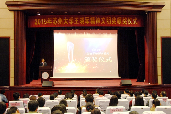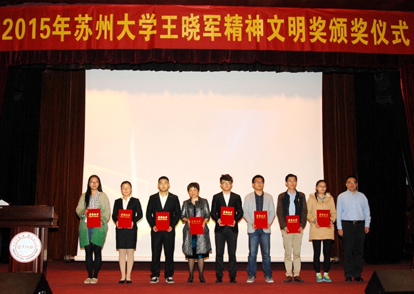 江作军在讲话中对获奖师生表示祝贺。他说,学校举行王晓军精神文明奖颁奖仪式是为了缅怀烈士、弘扬烈士精神,同时也是为了表彰先进,传播正能量。在苏大校园里,还有很多的老师、同学和今天受表彰的集体和个人一样,在用自己的实际行动践行“王晓军精神”,默默无闻、无私奉献。学校设立王晓军精神文明奖,并且坚持每年进行评选,就是希望不断扩大王晓军精神文明奖的影响,进一步推动学校精神文明建设,给行善者应有的尊重与肯定,在全校营造人人学习先进、争当先进的良好氛围。他希望同学们树立远大理想、追求崇高信念,加强修养、砥砺品德,心存感恩、关爱他人,用自己的实际行动弘扬“王晓军精神”,自觉践行社会主义核心价值观。