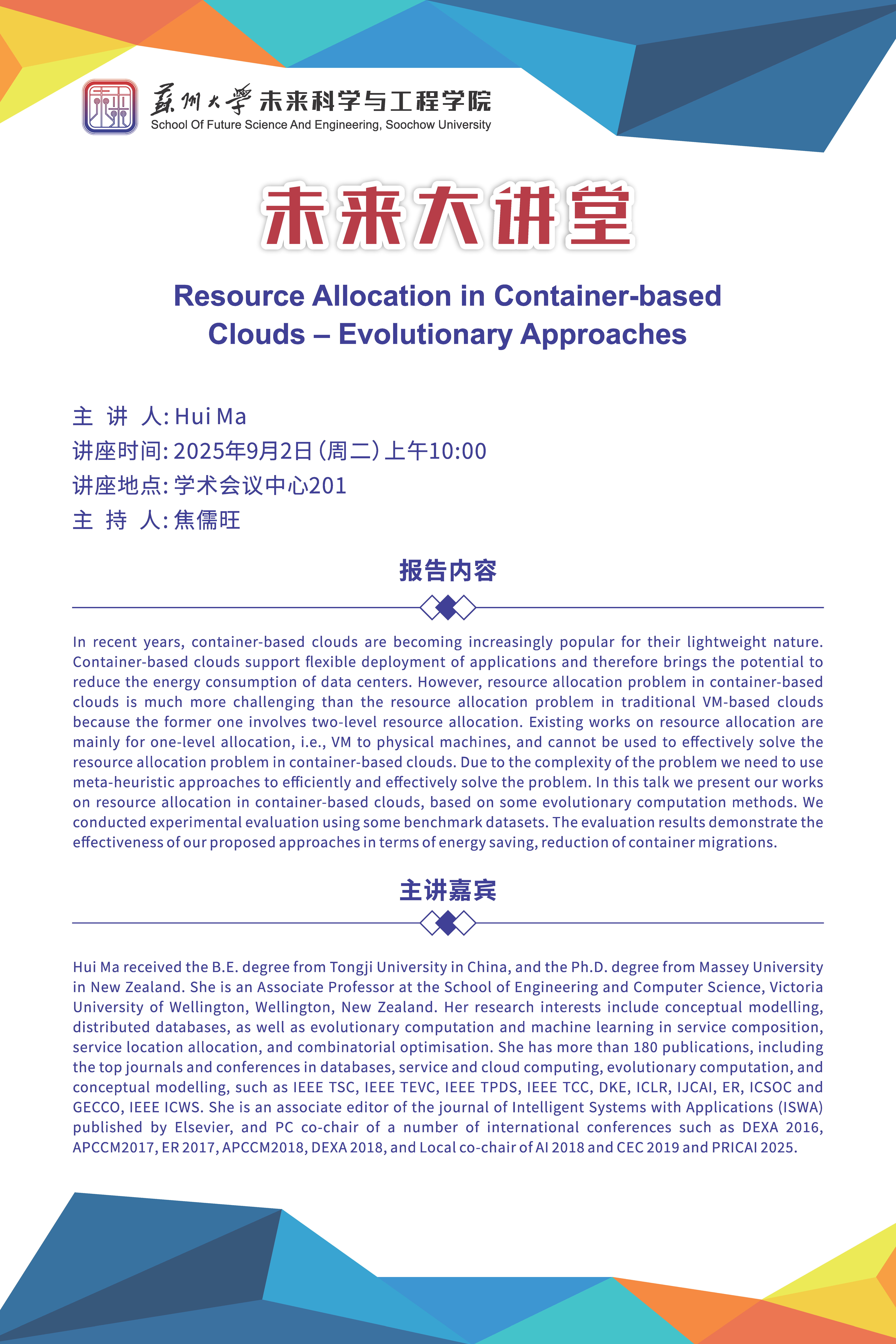未来科学与工程学院|未来大讲堂:Resource Allocation in Container-based Clouds – Evolutionary Approaches