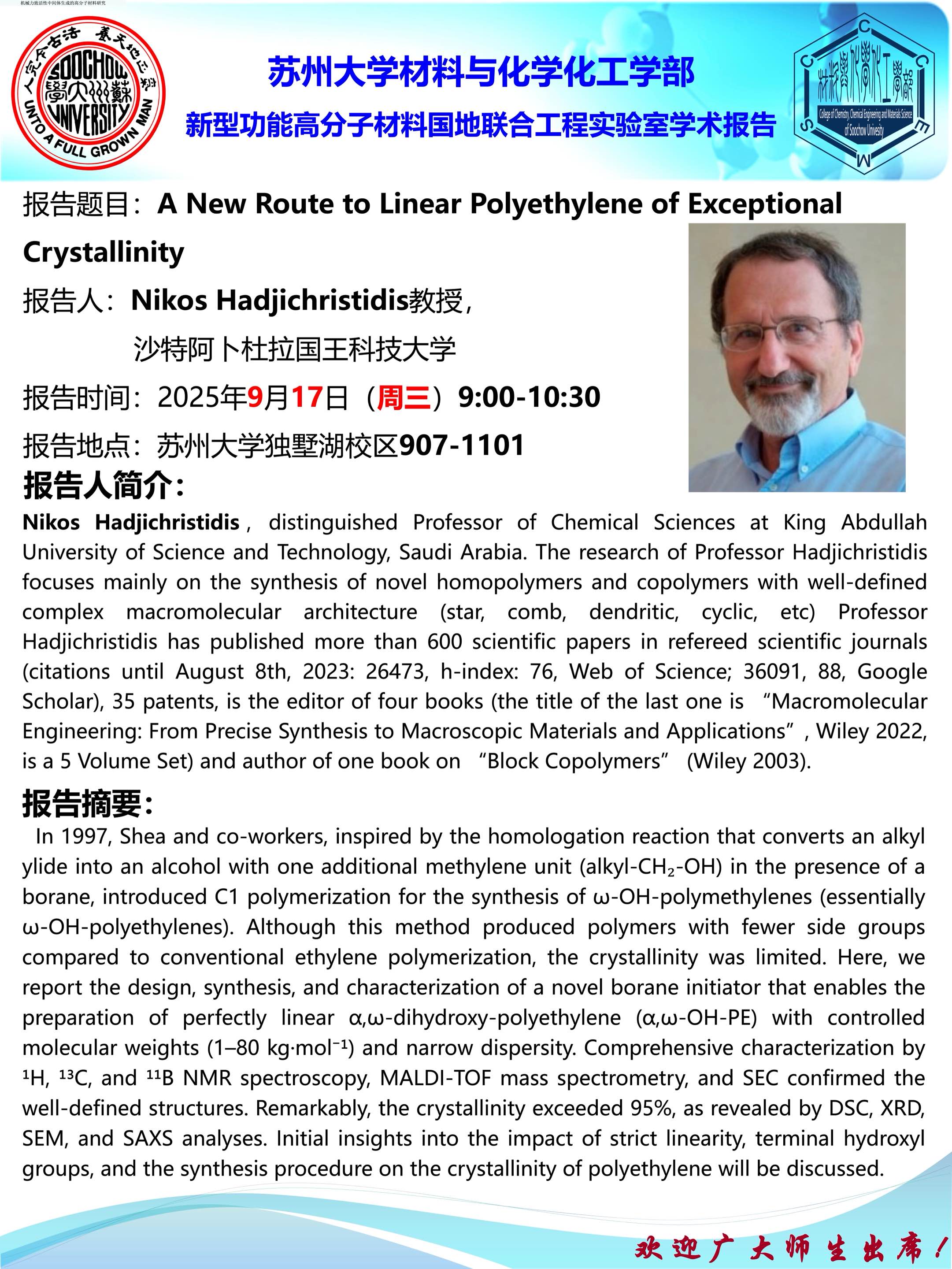 材料与化学化工学部学术报告:A New Route to Linear Polyethylene of Exceptional Crystallinity